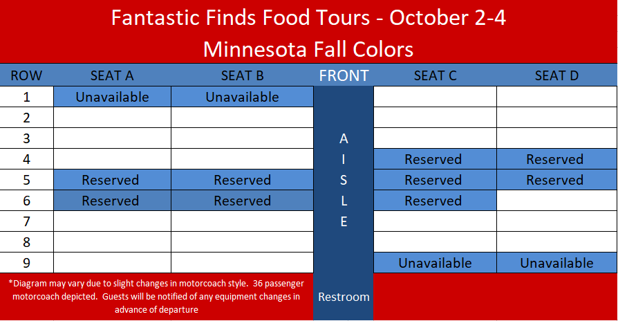 Please select your seat from the available spots above and indicate your choice along with any travel partners on the form at checkout. You will receive a confirmation with your seat numbers after your reservation has been made. Please allow 48 hours for confirmation as seats are manually updated.