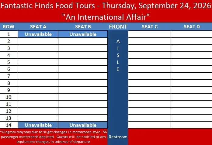 Please select your preference from the seating chart below. Please note that the seating chart is not updated in real time so we can’t guarantee the seat you select will be available. Please feel free to offer a couple of options in the notes area at check out so we can accommodate you, especially if you have a large travel party. We will always do our best to get you in the specified seats and with your group.